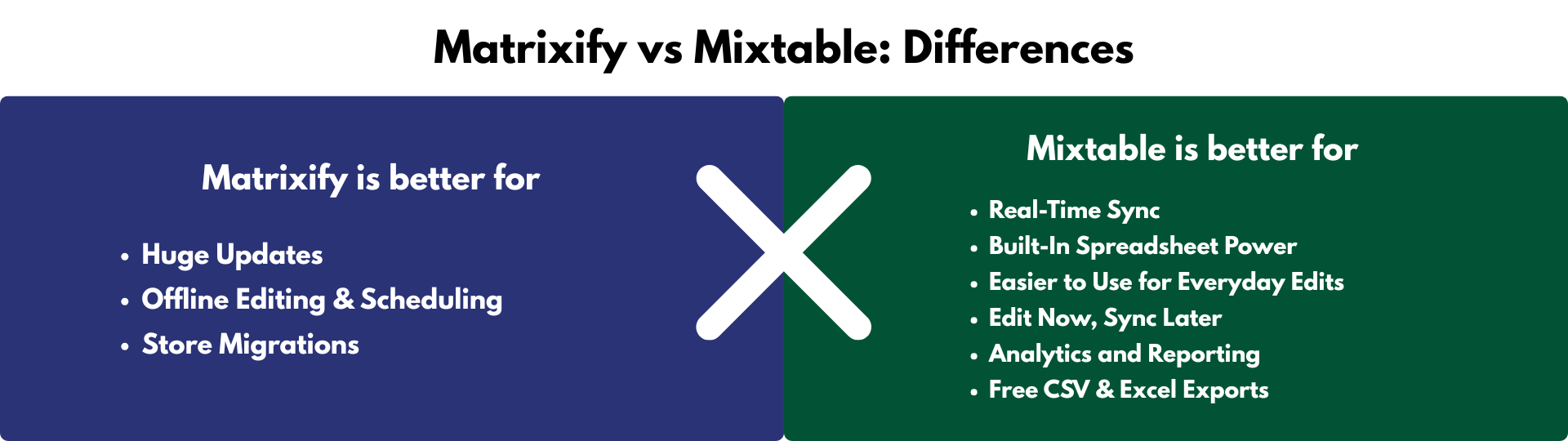 With so many overlapping features, choosing between Matrixify and Mixtable can be a challenge for store owners. This high-level comparison table breaks down their similarities and key differences, helping you quickly identify which app is best suited for your store’s needs.