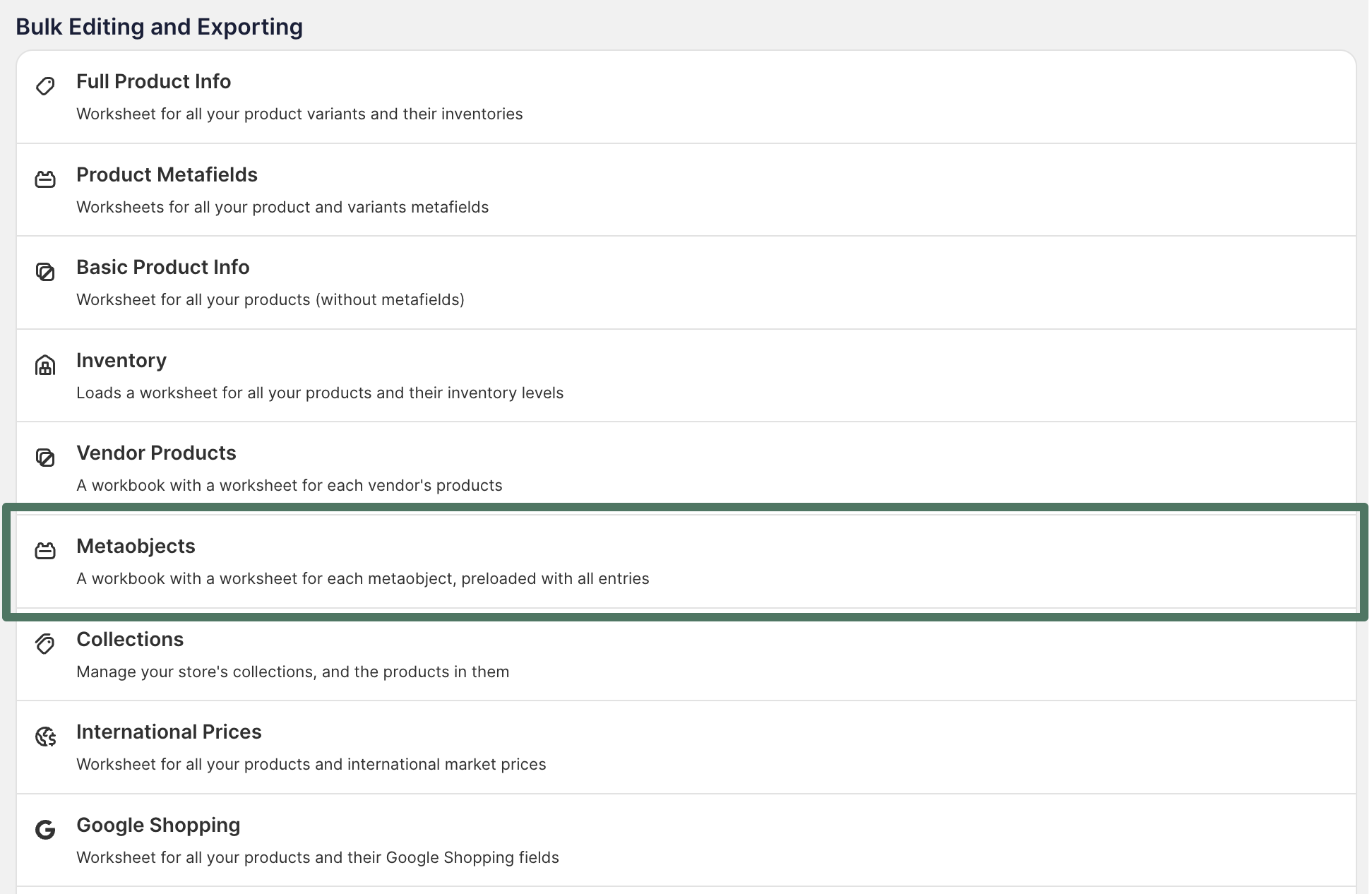 - I don’t see a worksheet for my metaobject: Confirm the metaobject definition exists in Shopify, then create a new Metaobjects workbook (or refresh/reconnect the workbook).