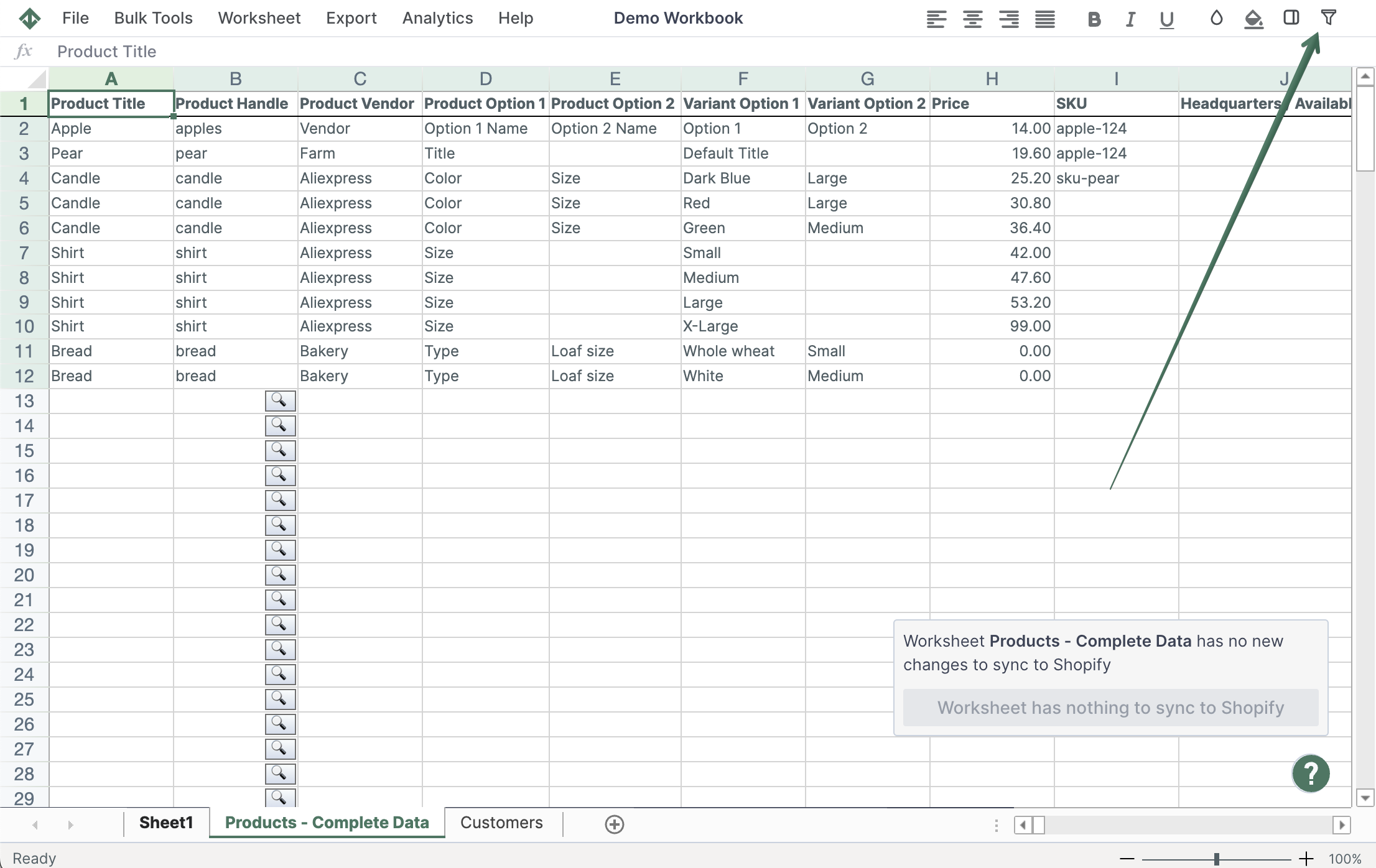 Solution: It is possible to look at products, inventory, and prices all on one screen with a spreadsheet app. Here’s how it works: