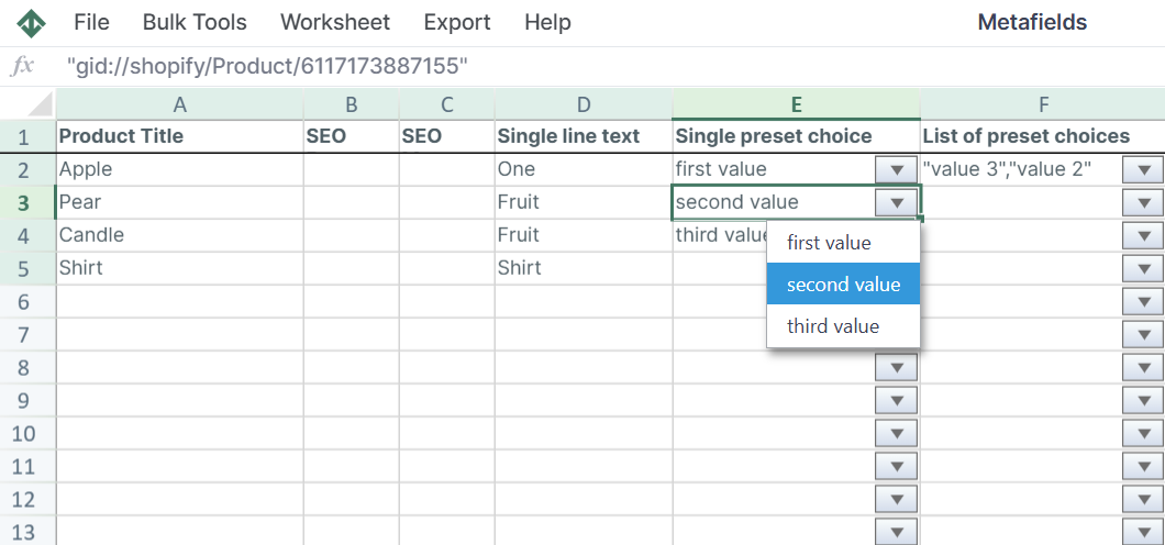 Problem: Is there a way to append a new value to a multi-value metafield without overwriting existing values? The native bulk editor’s current functionality replaces existing values, which is not the desired outcome.